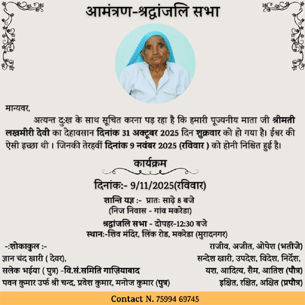 सलेक भैया की माता जी की श्रद्धांजलि सभा मकरेड़ा में नौ नवंबर को