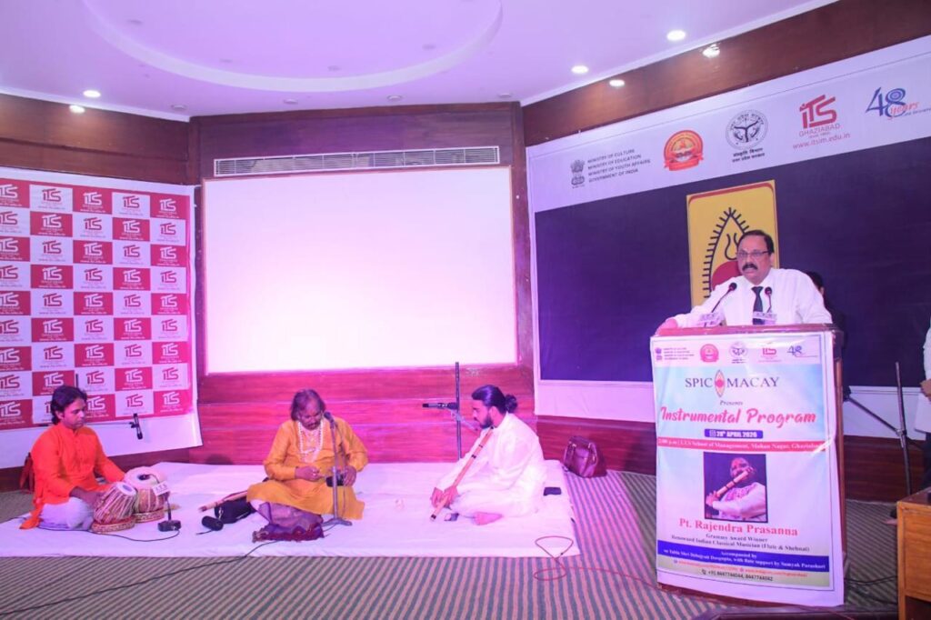 गाजियाबाद। आई.टी.एस स्कूल आॅफ मैनेजमेंट, मोहन नगर, गाजियाबाद में 28 अप्रैल 2026 को स्पिक मैके के सहयोग से पीजीडीएम (2025-27) बैच के विद्यार्थियों के लिए एक अत्यंत भावपूर्ण एवं ज्ञानवर्धक शास्त्रीय वाद्य संगीत कार्यक्रम का आयोजन संस्थान के द्रोणाचार्य आॅडिटोरियम में किया गया। कार्यक्रम का उद्देश्य छात्रों के बीच भारतीय शास्त्रीय संगीत के प्रति रुचि को बढ़ावा देना और उन्हें महान कलाकारों की जीवंत प्रस्तुति का अनुभव प्रदान करना था। कार्यक्रम का शुभारंभ पं. राजेंद्र प्रसन्ना (ग्रैमी पुरस्कार विजेता, बांसुरी एवं शहनाई वादक) देवज्योति दास गुप्ता (तबला) श्री राम मोरावल (बांसुरी), आई.टी.एस एजुकेशन ग्रुप के निदेशक (पीआर) सुरेंद्र सूद, आई.टी.एस स्कूल आॅफ मैनेजमेंट के निदेशक प्रो. डॉ. अजय कुमार द्वारा परम्परागत रूप से द्वीप प्रज्जवलन के साथ हुआ, जो ज्ञान और सकारात्मक ऊर्जा के प्रसार का प्रतीक है। इस अवसर पर आई.टी.एस स्कूल आॅफ मैनेजमेंट के निदेशक प्रो. डॉ. अजय कुमार एवं आई.टी.एस एजुकेशन ग्रुप के निदेशक (पीआर) श्री सुरेंद्र सूद द्वारा मुख्य अतिथियों को पुष्पगुच्छ, स्मृति चिन्ह एवं शॉल भेंट कर उनका औपचारिक स्वागत एवं सम्मान किया गया।
