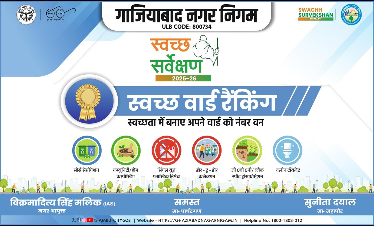 गाजियाबाद। नगर निगम द्वारा स्वच्छ सर्वेक्षण 2025-26 के अंतर्गत सभी वार्डों में स्वच्छ वार्ड प्रतियोगिता का सफल आयोजन किया जा रहा है। इस पहल का उद्देश्य शहर में स्वच्छता के प्रति जागरूकता बढ़ाना तथा वार्डों के बीच स्वस्थ प्रतिस्पर्धा को प्रोत्साहित करना है। इस प्रतियोगिता के अंतर्गत रहवासी संघ (आरडब्ल्यूए), होटल, हॉस्पिटल, कार्यालय एवं स्कूलों में भी स्वच्छता की रैंकिंग की जाएगी। शहर के इन सभी संस्थानों एवं क्षेत्रों का निरीक्षण कर विभिन्न मानकों के आधार पर मूल्यांकन किया गया। मूल्यांकन के प्रमुख मापदंडों में स्रोत पर कचरा पृथक्करण, सार्वजनिक स्थलों की साफ-सफाई, डोर-टू-डोर कलेक्शन व्यवस्था तथा जनभागीदारी शामिल रही। प्रत्येक वार्ड एवं संस्थान को इन मापदंडों पर अंक प्रदान कर रैंकिंग तय की जाऐगी। नगर निगम अधिकारियों के अनुसार, यह पहल न केवल स्वच्छता व्यवस्था को सुदृढ़ करेगी, बल्कि नागरिकों, संस्थानों एवं संगठनों को भी अपने क्षेत्र को स्वच्छ और व्यवस्थित रखने के लिए प्रेरित करेगी। नगर निगम ने सभी नागरिकों से अपील की है कि वे स्वच्छता अभियान में सक्रिय भागीदारी निभाएं और अपने वार्ड को स्वच्छ, सुंदर एवं आदर्श बनाने में सहयोग करें।